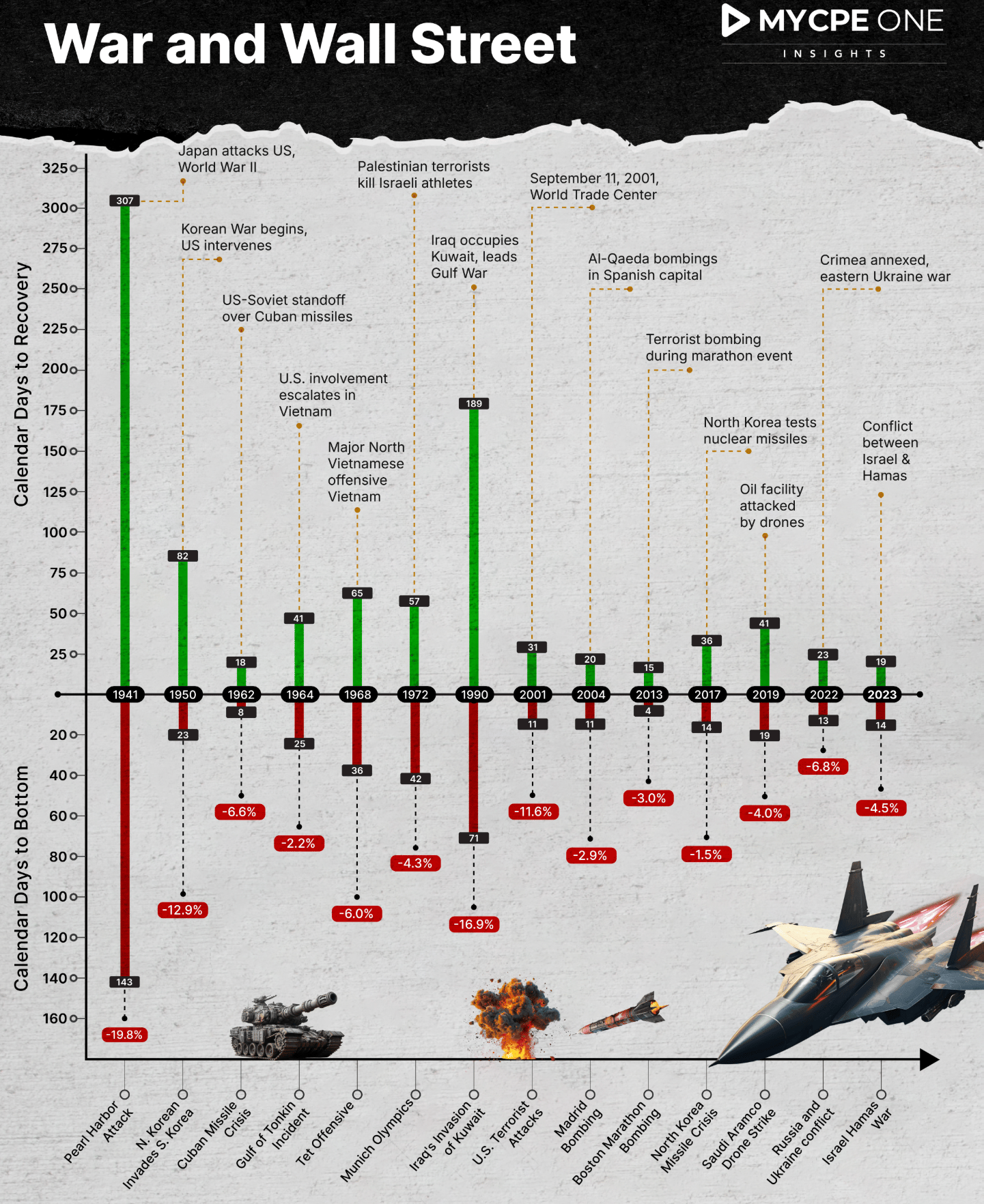 - When North Korea invaded South Korea in 1950, U.S. stocks did fall, but the damage was short-lived. The maximum drawdown after the event was about 12.9%, the bottom came 19 days later, the market recovered within 59 days.