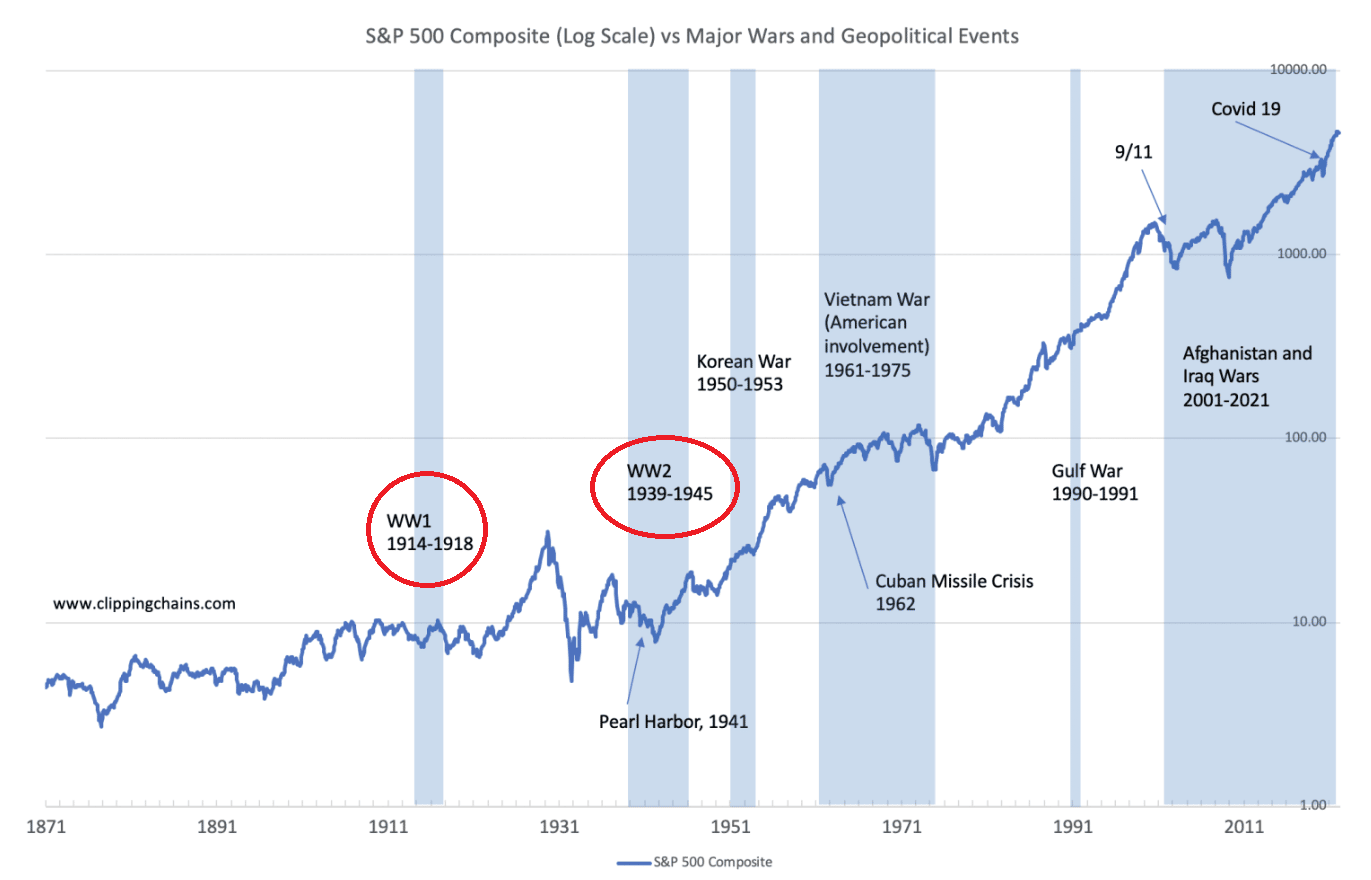During the two World Wars, the US stock markets generally performed better than many people would expect after the initial panic.